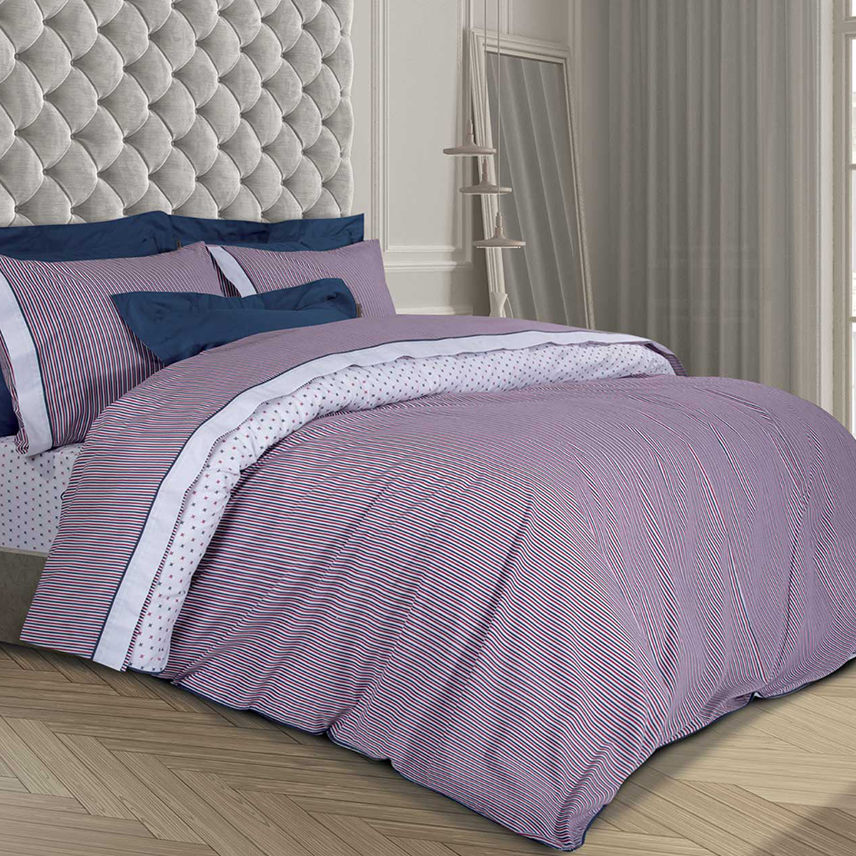 Παπλωματοθήκη υπέρδιπλη σετ σε μπλε χρώμα, με κόκκινες-λευκές λεπτομέρειες και ριγέ σχέδιο από τον οίκο Greenwich Polo. Είναι κατασκευασμένη Η σύνθεση του υφάσματος είναι από 70% βαμβάκι 30% polyester 150 κλωστών , που την καθιστά εξαιρετικά μαλακή και ανθεκτική. Η παπλωματοθήκη είναι διπλής όψεως, με την μία πλευρά να έχει το σχέδιο του πανωσέντονου και την άλλη το σχέδιο του κατωσέντονου. Διαθέτει κλείσιμο με κουμπιά. Στο σετ περιλαμβάνονται οι μαξιλαροθήκες φάκελος με το σχέδιο του πανωσέντονου. Συνδυάστε το με τα υπόλοιπα είδη της ίδιας σειράς για ένα ολοκληρωμένο αποτέλεσμα στην κρεβατοκάμαρα σας.