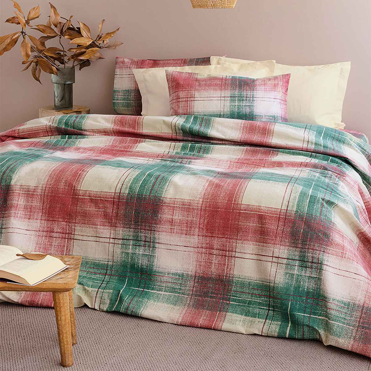 Σετ φανελένια μονά σεντόνια σε πράσινο-κόκκινο χρώμα, με εκρού λεπτομέρειες και καρό σχέδιο από την εταιρεία Palamaiki. Το ύφασμα είναι 100% βαμβακερή φανέλα βάρους 190 gsm που τα καθιστά ιδανικά για τους χειμερινούς μήνες, καθώς προσφέρει ζεστασιά και απαλότητα. Υπάρχει επιλογή τύπου κατωσέντονου με ή χωρίς λάστιχο. Η μαξιλαροθήκη είναι φάκελος με το σχέδιο του πανωσέντονου. **Το σχέδιο στη μαξιλαροθήκη ενδέχεται να διαφέρει από αυτό της φωτογραφίας, καθώς η εταιρεία παράγει μαξιλαροθήκες από όλο το σχέδιο του υφάσματος και τις συσκευάζει με τυχαία σειρά.**Συνδυάστε τα με τα υπόλοιπα είδη της ίδιας σειράς για ένα ολοκληρωμένο αποτέλεσμα.