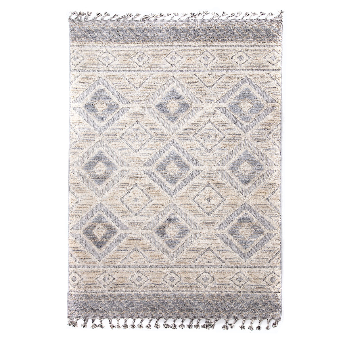 Χαλί μηχανής από τη σειρά La Casa της εταιρείας Royal Carpet σε γκρι και εκρού αποχρώσεις. Εκλεπτυσμένο και απαλό χαλί με εντυπωσιακό γεωμετρικό σχέδιο με έθνικ και boho επιρροές. Μπορεί να τοποθετηθεί σε όλους τους χώρους του σπιτιού αναβαθμίζοντας την αισθητική τους. Είναι κατασκευασμένο από εξαιρετικής ποιότητας μαλακά και ανεξίτηλα νήματα από 100% πολυπροπυλένιο. Tο βάρος του είναι 2.400gsm, ενώ η πυκνότητά του ανέρχεται στους 96.000 κόμπους/τ.μ. Η απαλή και ανάγλυφη επιφάνεια του χαλιού σε συνδυασμό με το πέλος ύψους 15mm, εξασφαλίζουν μία μοναδική αίσθηση στο πάτημα. Διαθέτει περίτεχνα δίχρωμα κρόσσια. Το υπόστρωμά του είναι υφαντό, στοιχείο που το καθιστά ιδιαίτερα ανθεκτικό. Είναι αντιστατικό επομένως δεν μαγνητίζονται χνούδια, μικροσωματίδια και σκόνη στην επιφάνεια του χαλιού. Δεν εμπεριέχει επικίνδυνες για τον ανθρώπινο οργανισμό αλλεργιογόνες ή χημικές βλαβερές ουσίες. Τα χαλιά της συλλογής La Casa μπορούν να συνδυαστούν με όλα τα στυλ διακόσμησης και θα προσθέσουν μία πινελιά πολυτέλειας στο χώρο σας. Τα χαλιά Royal Carpet είναι φιλικά προς την υγεία και το περιβάλλον, καθώς είναι υποαλλεργικά και οικολογικά.