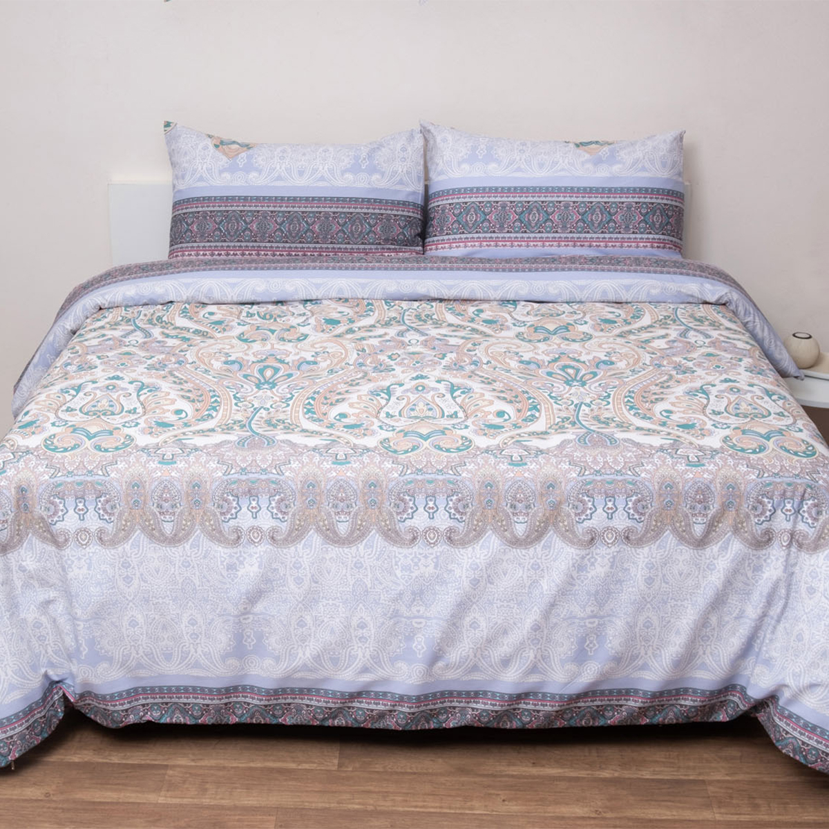 Κουβερλί μονό σε γαλάζιο φόντο, με πολύχρωμες λεπτομέρειες και έθνικ σχέδιο από την εταιρία Viopros. Το εξωτερικό του ύφασμα είναι από 100% βαμβάκι ενώ εσωτερικά διαθέτει λεπτή πολυεστερική βάτα. Το κουβερλί είναι διπλής όψης καθώς από την μία μεριά έχει το σχέδιο του πανωσέντονου κι από την άλλη το σχέδιο του κατωσέντονου. Στο σετ περιλαμβάνεται η μαξιλαροθήκη φάκελος με το σχέδιο του πανωσέντονου. **Το σχέδιο στη μαξιλαροθήκη ενδέχεται να διαφέρει από αυτό της φωτογραφίας καθώς η εταιρεία παράγει μαξιλαροθήκες από όλο το σχέδιο του υφάσματος και τις συσκευάζει με τυχαία σειρά** Συνδυάστε το με τα υπόλοιπα είδη της ίδιας σειράς για ένα ολοκληρωμένο αποτέλεσμα.