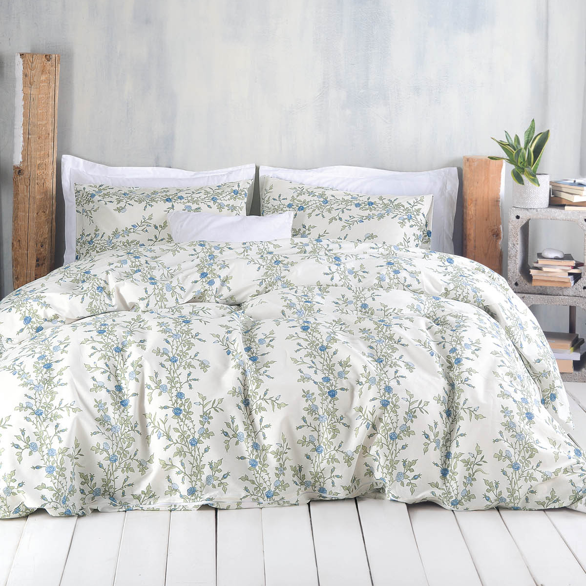 Υπέρδιπλη παπλωματοθήκη με φερμουάρ από την εταιρεία Rythmos με σε εκρού χρώμα με πράσινες-μπλε λεπτομέρειες και φλοράλ σχέδιο. Η ποιότητά της από 50% βαμβάκι-50% polyester 144 κλωστών την καθιστά απαλή και ανθεκτική. Στο σετ περιλαμβάνονται οι μαξιλαροθήκες φάκελος. Συνδυάστε την με τα υπόλοιπα προϊόντα της ίδιας σειράς για ένα ολοκληρωμένο αποτέλεσμα.**Το σχέδιο στις μαξιλαροθήκες ενδέχεται να διαφέρει από αυτό της φωτογραφίας καθώς η εταιρεία παράγει μαξιλαροθήκες από όλο το σχέδιο του υφάσματος και τις συσκευάζει με τυχαία σειρά**
