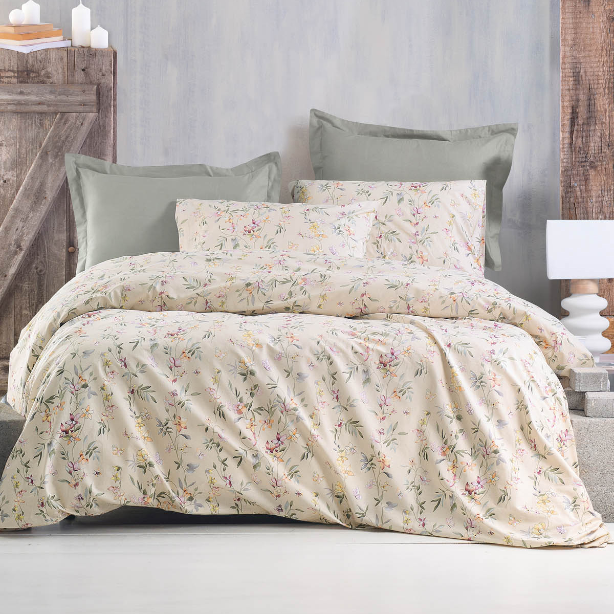 Υπέρδιπλο κουβερλί από την εταιρεία Rythmos σε μπεζ χρώμα με μωβ-κίτρινες-πράσινες λεπτομέρειες και φλοράλ σχέδιο. Το εξωτερικό του ύφασμα είναι από 100% βαμβάκι 144 κλωστών προσφέρει ανθεκτικότητα και απαλότητα ενώ εσωτερικά έχει λεπτή πολυεστερική βάτα. Στο σετ περιλαμβάνονται οι μαξιλαροθήκες φάκελος με το σχέδιο του πανωσέντονου. Ιδανικό σκέπασμα για τους ανοιξιάτικους και καλοκαιρινούς μήνες. Συνδυάστε το με τα υπόλοιπα είδη της ίδιας σειράς για ένα ολοκληρωμένο αποτέλεσμα.