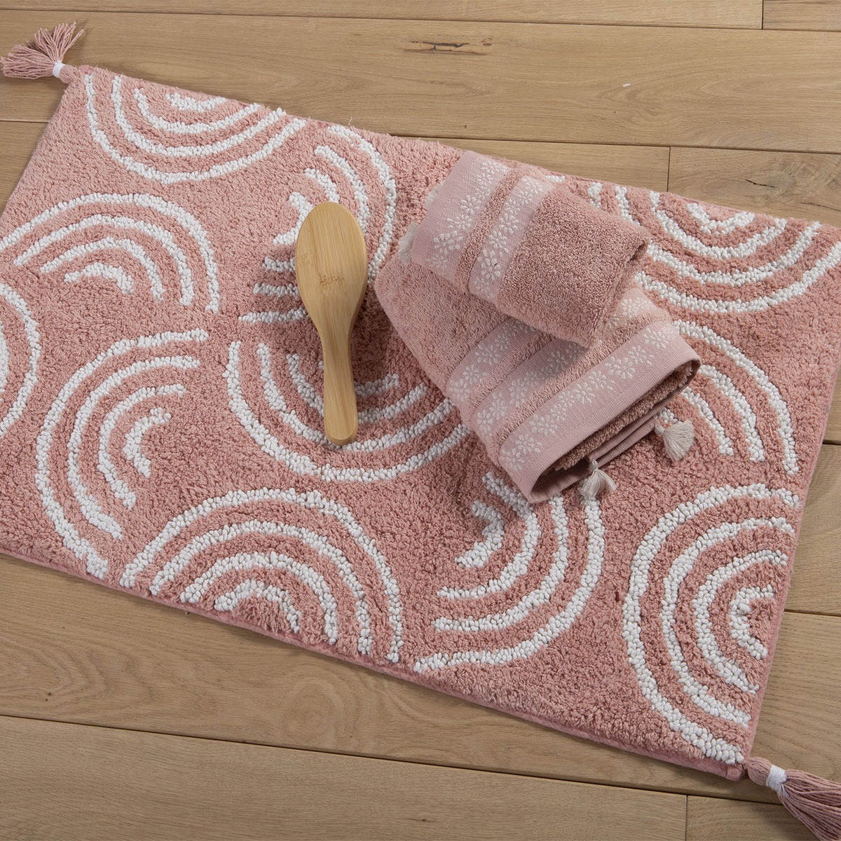 Πατάκι μπάνιου από την εταιρεία Nef-Nef σε ροζ απόχρωση με λευκές λεπτομέρειες και γεωμετρικό σχέδιο. Διαθέτει 4 φουντάκια στις γωνίες. Είναι κατασκευασμένο από 100% βαμβάκι βάρους 2000gsm που το καθιστά αρκετά απορροφητικό και απαλό.