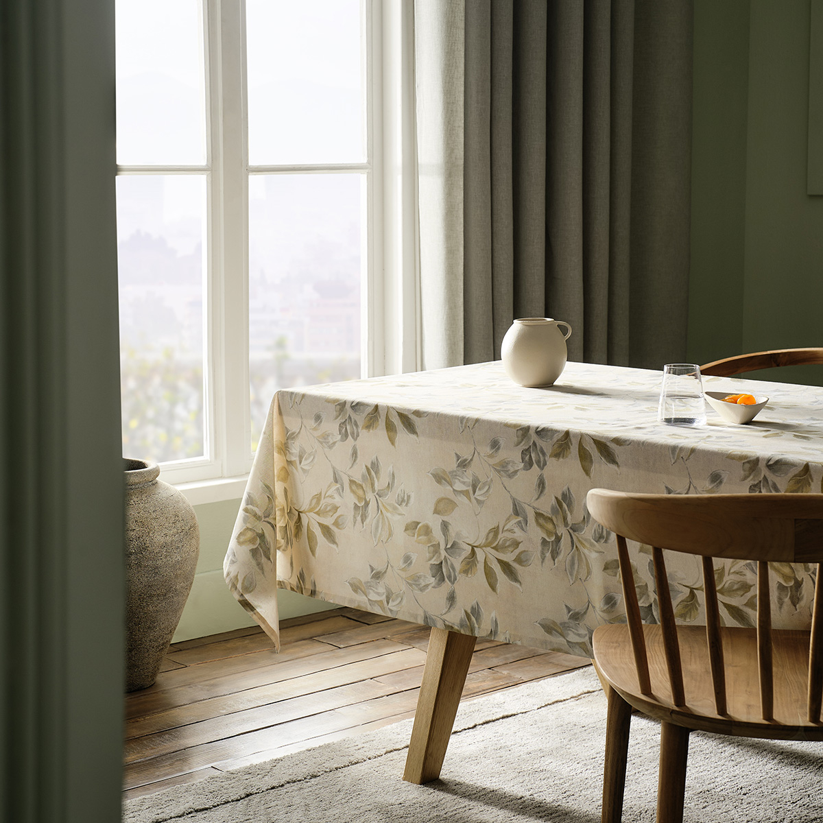 Τραπεζομάντηλο 150x220 από την εταιρεία Gofis Home σε εκρού απόχρωση με πράσινες-γκρι λεπτομέρειες και φλοράλ σχέδιο. Έχει τυπωθεί με ανεξίτηλα και ανθεκτικά χρώματα. Είναι κατασκευασμένο από ύφασμα σύνθεσης 60% βαμβάκι και 40% polyester, με φινίρισμα ζεστού αέρα που το κάνει μαλακό και χυτό. Ιδανικό για να στολίσει το τραπέζι του σαλονιού σας αλλά και της τραπεζαρίας σας δίνοντας μια πινελιά πολυτέλειας στο χώρο.