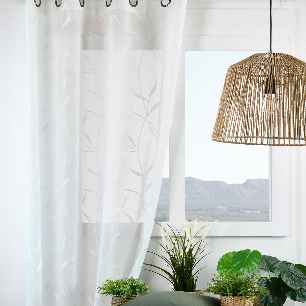 Κουρτίνα εσωτερικού χώρου, σε λευκό χρώμα και διακριτικό φλοράλ σχέδιο. Κατασκευασμένη από 100% polyester και ενσωματωμένα τρουκς για εύκολη τοποθέτηση. Το ύφασμα είναι χαμηλής σκίασης. Διακοσμήστε την σε όποιο χώρο του σπιτιού σας επιθυμείτε και δημιουργήστε ένα ξεχωριστό στυλ. Συνδυάστε τη με τα υπόλοιπα είδη της ίδιας σειράς για ένα ολοκληρωμένο αποτέλεσμα στο χώρο σας.