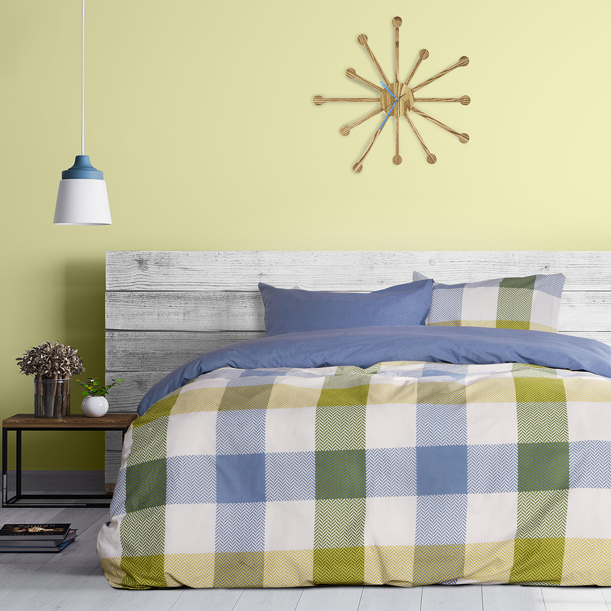 Μονό κουβερλί από την εταιρεία Kocoon με καρό σχέδιο. Το ύφασμα είναι 100% βαμβάκι 144 κλωστών σε εκρού-μπλε χρώμα με πράσινες-ώχρα λεπτομέρειες. Εσωτερικά έχει λεπτή πολυεστερική βάτα, που το καθιστά ιδανικό σκέπασμα για τους ανοιξιάτικους και καλοκαιρινούς μήνες. Η μία μεριά έχει το σχέδιο του πανωσέντονου και η άλλη το σχέδιο του κατωσέντονου.