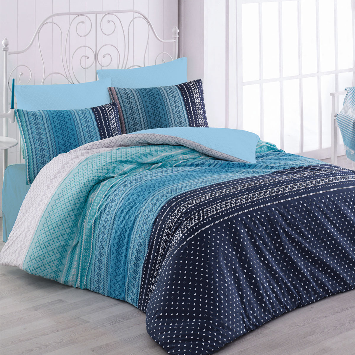 Μονό κουβερλί από την εταιρεία Anna Riska με έθνικ σχέδιο. Το ύφασμα του έχει σύνθεση από 100% βαμβάκι περκάλι 170 κλωστών που προσφέρει απαλότητα και ανθεκτικότητα. Έχει γαλάζιο-μπλε χρώμα με εκρού λεπτομέρειες. Εσωτερικά έχει λεπτή πολυεστερική βάτα. Ιδανικό για τους ανοιξιάτικους και καλοκαιρινούς μήνες. Το κουβερλί είναι διπλής όψεως, με την μία πλευρά να έχει το σχέδιο του πανωσέντονου και την άλλη το σχέδιο του κατωσέντονου. Η μαξιλαροθήκη είναι φάκελος με το σχέδιο του πανωσέντονου. **Το σχέδιο στην μαξιλαροθήκη ενδέχεται να διαφέρει από αυτό της φωτογραφίας καθώς η εταιρεία παράγει μαξιλαροθήκες από όλο το σχέδιο του υφάσματος και τις συσκευάζει με τυχαία σειρά.**
