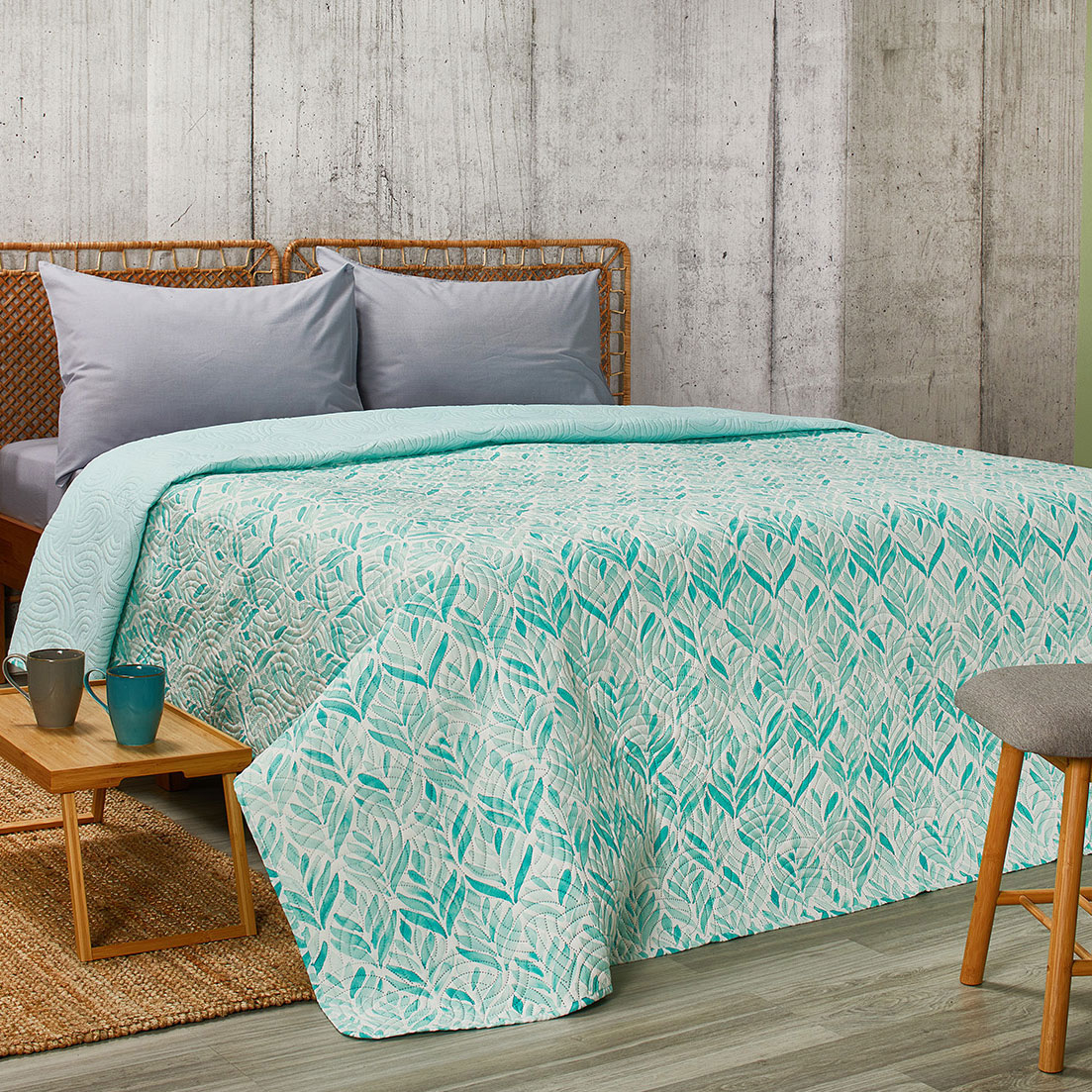 Κουβερλί μονό διπλής όψης με καπιτονέ ανάγλυφο σχέδιο σε βεραμάν χρώμα με λευκές-τυρκουάζ λεπτομέρειες και γεωμετρικό σχέδιο από την εταιρεία Whitegg. Το εξωτερικό του ύφασμα είναι από 100% polyester και εσωτερικά διαθέτει λεπτή πολυεστερική βάτα. Η μία πλευρά έχει σχέδιο και η άλλη είναι μονόχρωμη βεραμάν.
